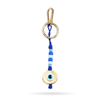 Keep good vibes close and bad juju far away with this chic golden evil eye bag charm. Featuring glossy blue and white beads strung on a bold cobalt cord, it is finished with a gleaming gold accent that catches the light beautifully. Clip it to your bag for a touch of protection and a pop of Mediterranean style- stylishly warding off negativity wherever you go.