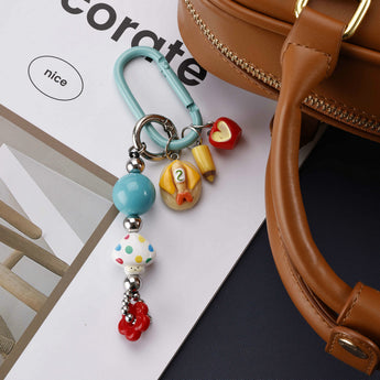 Bring back the joy of playtime with this colourful cutie! A pastel blue clip holds a happy mix of charms. - a cherry-red flower, a spotty little multi-coloured mushroom, a yellow pencil, an apple and a piece of sushi- because why not? It is cheerful, quirky and just the right amount of chaotic fun - the ultimate bag charm for someone who doesn't take life too seriously!