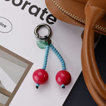 Adorable cherry-shaped bag charm bursting with personality! Featuring plump pink beads clustered together to form the fruit, perched atop a charming blue beaded stalk. This whimsical accessory adds a pop of colour and fun to your everyday bag, keys, or backpack. Perfect for cherry lovers and anyone who appreciates quirky, handcrafted details. A delightful little treasure that brings joy wherever it goes!