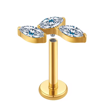 Delicate marquise gems nestled in an enchanting leaf design—this stud brings a touch of botanical elegance to your ear. Three sparkling stones catch the light with every turn of your head, creating a subtle shimmer that whispers rather than shouts. Perfect for those who love nature-inspired jewellery with a refined, understated charm. A playful nod to the garden, right where it belongs.