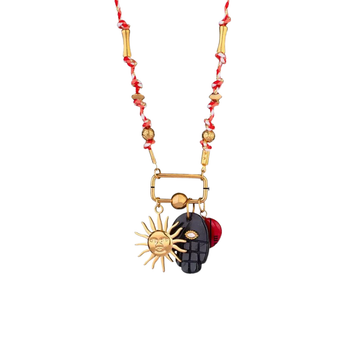Embrace a little protective magic with this charming Pebble Hamsa Necklace. The variegated cord features delicate gold bead inlays that lead to a beautifully textured pebble hamsa pendant, complete with a sparkling evil eye jewel inlay for extra good vibes. Finished with a sleek rectangular golden clasp, it's the perfect blend of spiritual symbolism and everyday style—because who doesn't want a little extra luck around their neck?