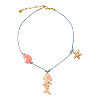 The one splashes in with a soft blue cord, a pink conch shell charm, a golden starfish charm and a cheeky fish-bone pendant that adds instant beach-day attitude.
