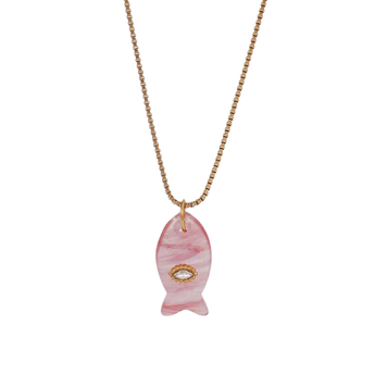 Dive into charm! Our Lucky Little Fish Necklaces features a smooth, polished fish in vibrant eye-catching colours.  Each one accented with a sparkling mini evil eye detail for a splash of good vibes. Strung onto a sleek gold chain these quirky little cuties bring a pop of colour, a touch of protection, and a whole lot of personality to any outfit. Wear one or wear a few to stand out in the crowd.