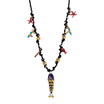Dive into fun with our reef necklaces. A bright cord sets the scene for a mini underwater party - complete with tiny fish, and the cutest gold-detailed dangling fish charm. It is sunshine, sea breeze, and holiday energy all wrapped into one playful piece. Wear it whenever you need and instant mood-boost or a splash of seaside magic.