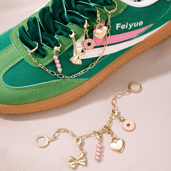 Turn your sneakers into a little moment with these lush green velvet laces, dressed up in a golden charm chain featuring an etched gold heart and doughnut and a glimmering gold bow with a cute accent of pink beads. It is soft, luxe and playfully glam - like slipping a mini jewellery box onto your shoes! Perfect for anyone who loves their kicks with a sprinkle of charm and a dash of velvet magic.