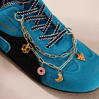 Serve up some serious sneaker spice with these black-and-white laces paired with the cutest foodie charms. From a pink-frosted doughnut, to a cheesy pizza slice, a buttery croissant and a tiny pretzel - this set is basically a whole snack break for your shoes.